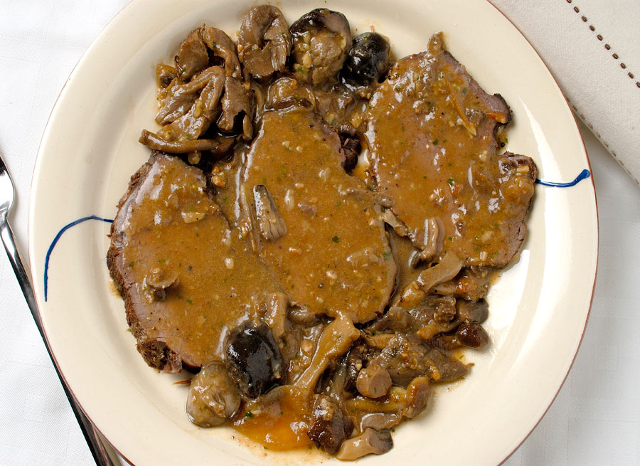 Salpebrem la carn i la posem a rostir el rodó a una cassola amb una mica d'oli junt amb la ceba, tomàquet, pastanaga i alls (tot sencer).
