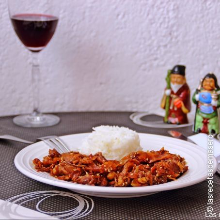 Para empezar la semana os voy a mostrar una manera deliciosa de cocinar un ingrediente tan versátil como es el pollo, la receta es de mi madre, que lleva ya años haciéndola y que la tomó prestada de no se que revista...en la que venían recetas asiáticas, en este caso esta es una receta china.