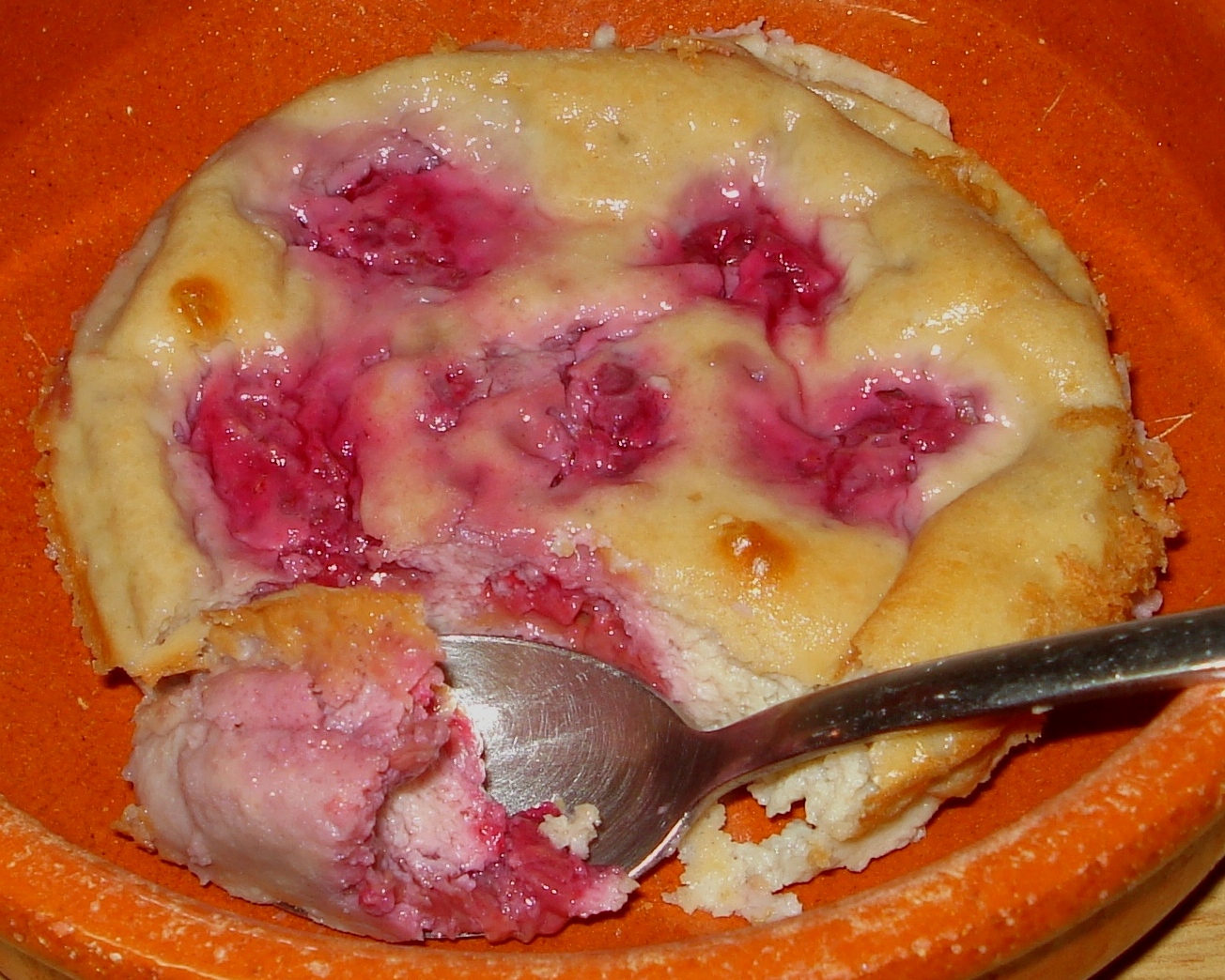 Repartir las frambuesas lavadas en tazas individuales (que vayan al horno), verter la masa por encima y hornear a 180°C (horno precalentado) durante 30 minutos.