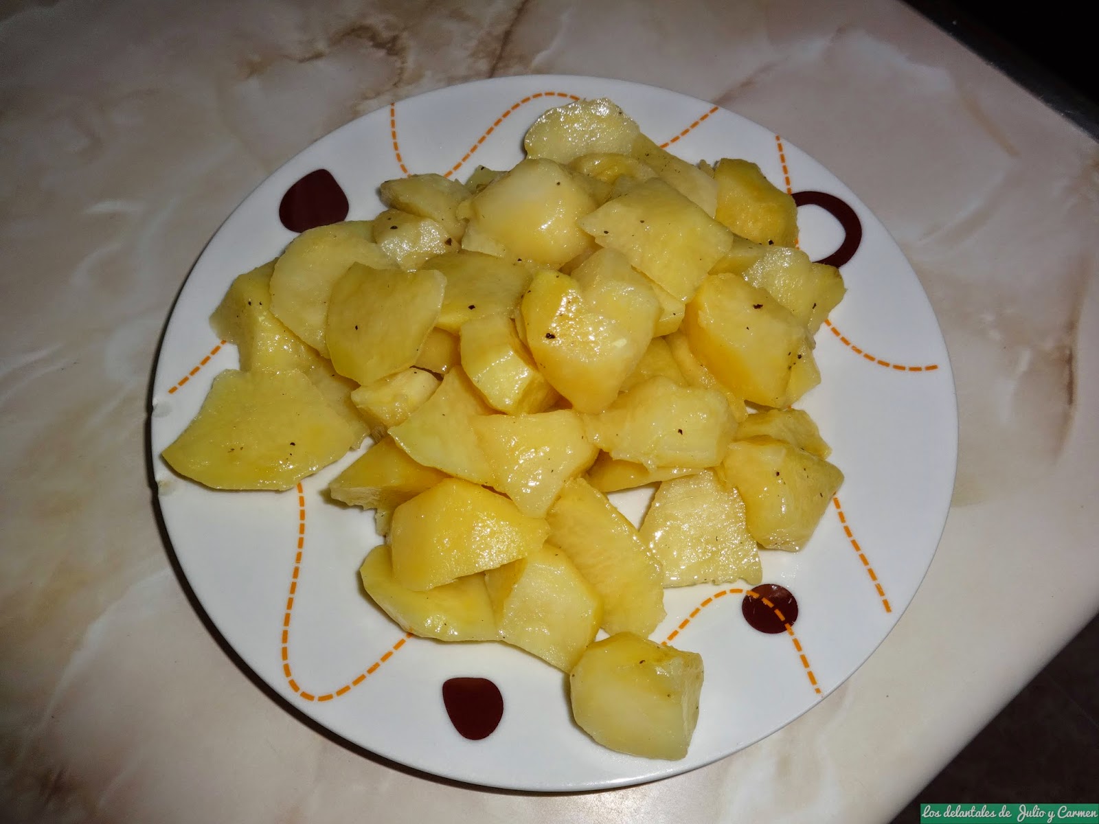 Lo primero, pelaremos y cortaremos las patatas en trozos de mas o menos en mismo tamaño, y las pondremos en una fuente apta para microondas.