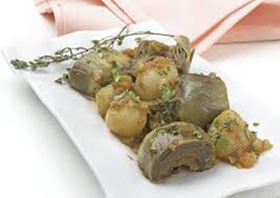 Quita las hojas duras a las alcachofas, corta cada una en 4 o 6 trozos a lo largo, frota con limón y cuece en agua hirviendo durante 8 minutos, escurre, refresca con agua.