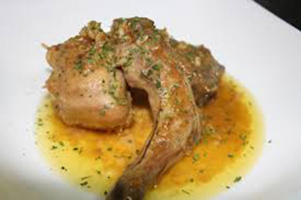 Una vez dorado; añadimos los ingredientes del mortero y el vino blanco y junto con el romero, tomillo y perejil, y removemos todo muy bien para que el conejo se impregne bien de cada sabor.