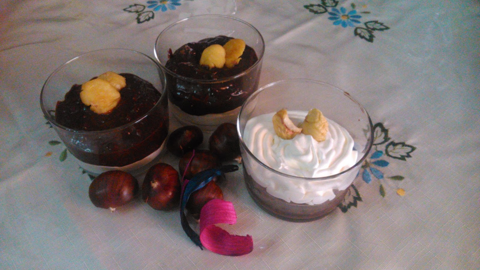 Vamos rellenando los moldes individuales (o un molde grande, como queráis) con una base de nata montada y la crema de castañas con chocolate arriba. O al revés, la crema de castañas abajo y la nata arriba.