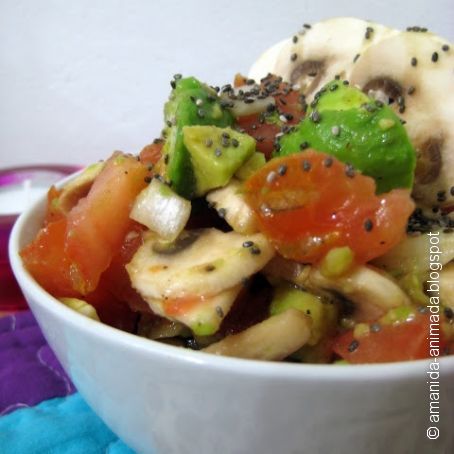 Lavamos y cortamos el tomate a cuadraditos pequeños. Partimos el aguacate por la mitad, sacamos el hueso y lo cortamos a rectángulos pequeños. Limpiamos los champiñones con un pincel de cocina y los cortamos a láminas muy finitas. La cebolla tierna la hacemos a trocitos pequeños. Mezclamos todo en un bol.