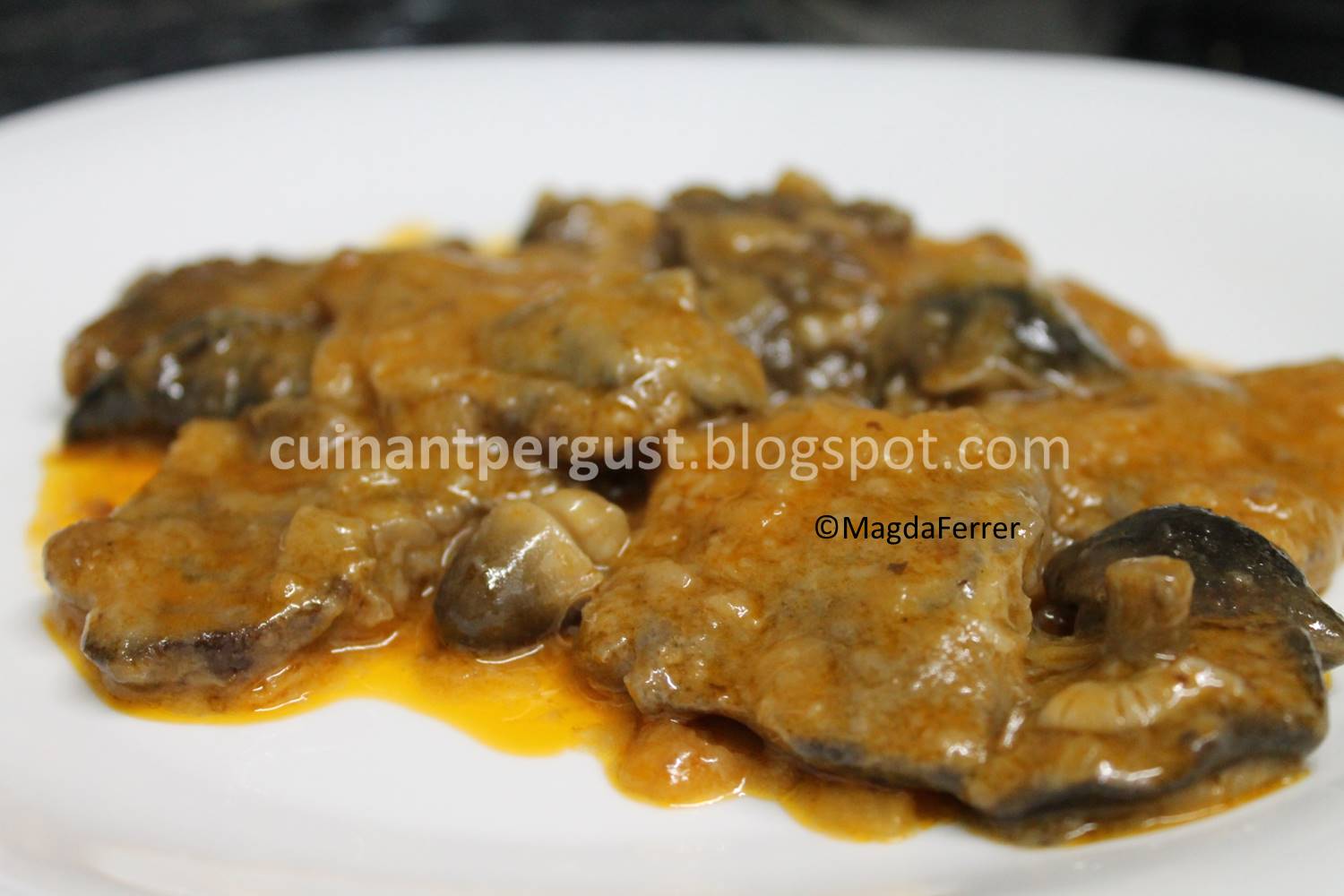 En el mismo aceite hacer un sofrito con la cebolla y el tomate. Añadir las setas, remover y salar. Añadir la carne y el coñac. Flambear o dejar reducir para que el alcohol se evapore. Añadir el vino blanco, remover y dejar reducir para que el alcohol se evapore. Cubrir con agua y rectificar de sal. Dejar cocer a fuego lento hasta que la carne esté muy tierna. Servir.