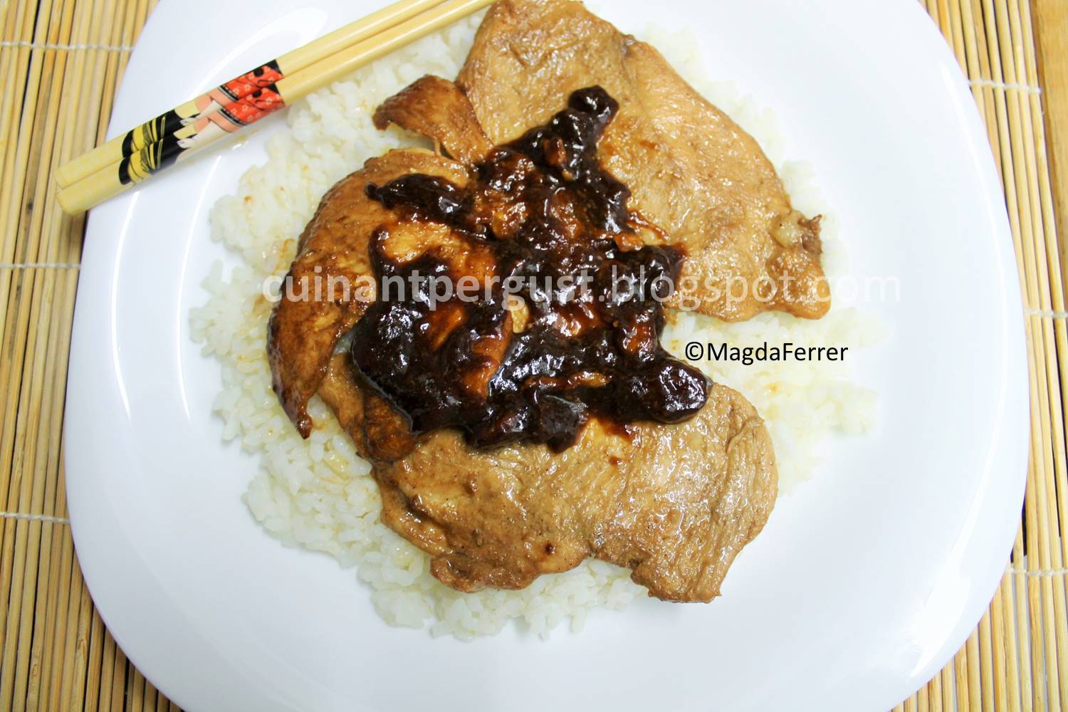 Disponer en un plato un lecho de arroz hervido. Sobre él colocar los filetes y sobre ellos la salsa glaseada. Servir.