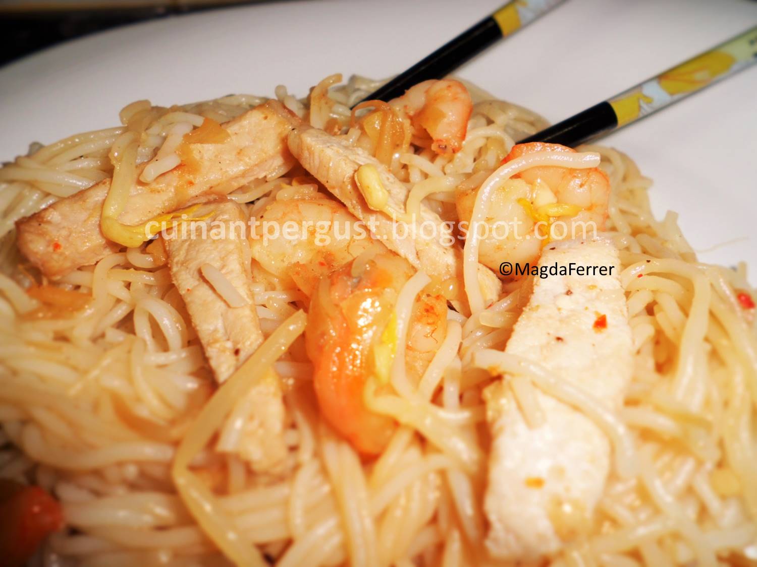 Retirar la grasa y en aceite limpio freír la cebolla y el ajo. Añadir las especias, las cucharadas de agua, la soja y el germen de soja y cocinar unos 3-4 minutos. Añadir el cerdo, los langostinos y los fideos. Salpimentar con moderación y remover para mezclar todos los ingredientes. Servir.