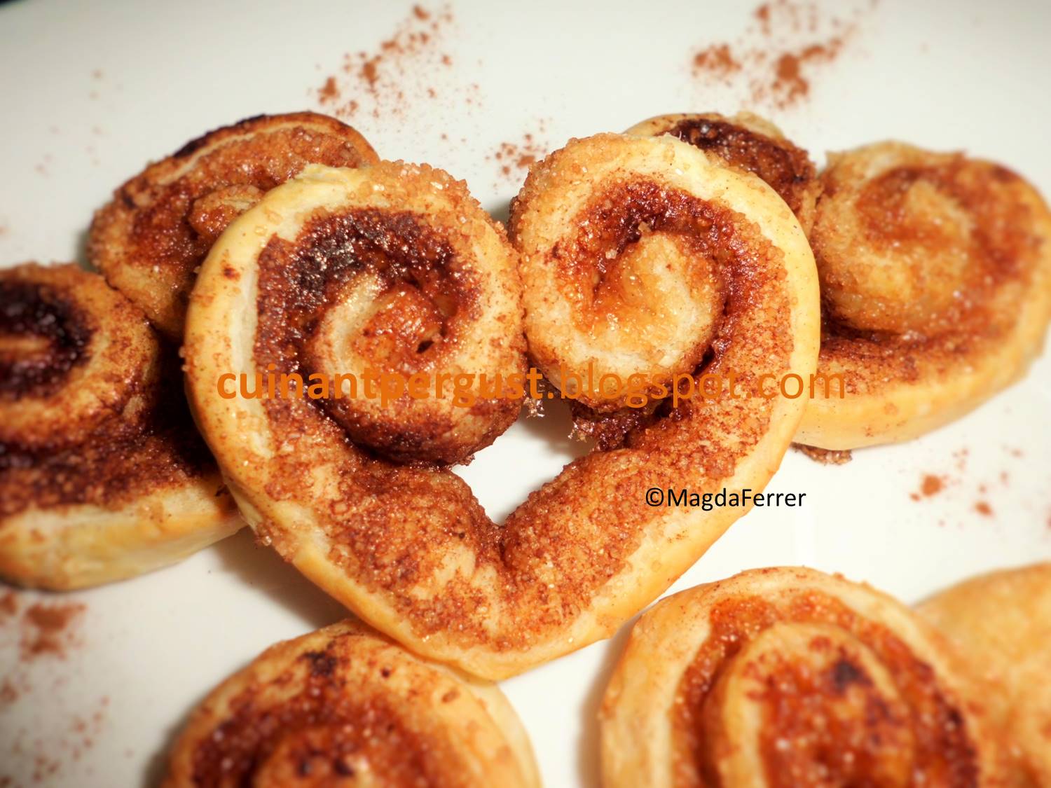 Forrar la bandeja del horno con papel vegetal. Colocar los rollitos en ella dejando espacio entre ellos, ya que aumentarán de tamaño. Pellizcar la base de cada rollito estirando ligeramente para darles forma de corazón.