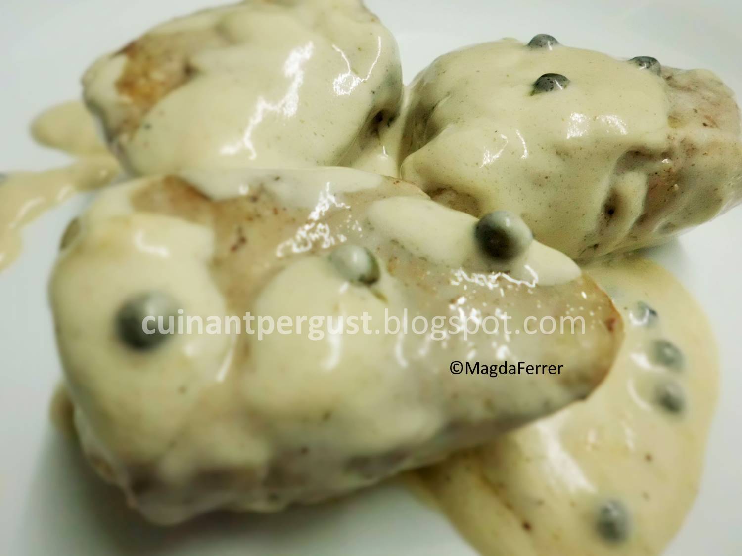 Añadir las bolas de pimienta a la misma grasa de freír el solomillo y dejarlas unos segundos. Añadir un chorro de coñac y flambear. Dejar que se apague por sí solo. Agregar la nata, salar al gusto y remover unos minutos para que todos los ingredientes se amalgamen. La salsa estará lista cuando empiece a “burbujear” y a espesar ligeramente. Rectificar de sal si es necesario. Añadir el solomillo a la salsa para que se empape. Servir.