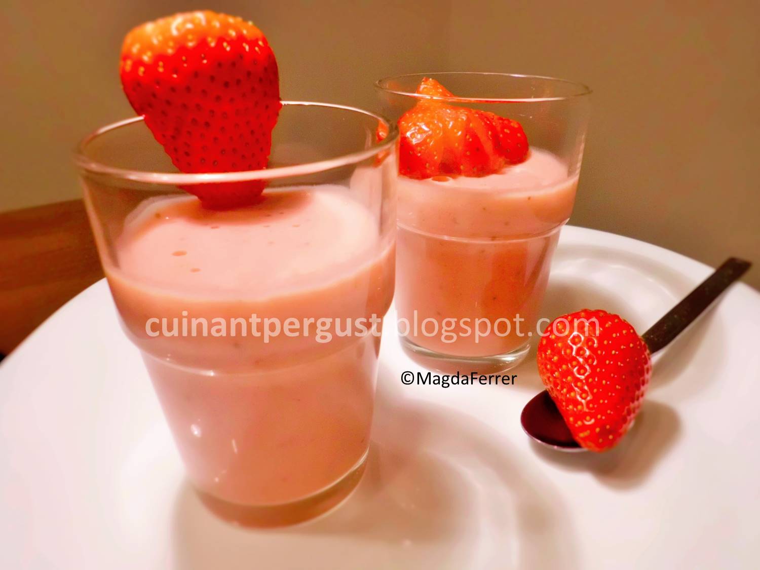 Repartir la mezcla en vasitos o tarrinas individuales y dejar enfriar en el frigorífico hasta que cuaje. Adornar con un fresón. Servir.