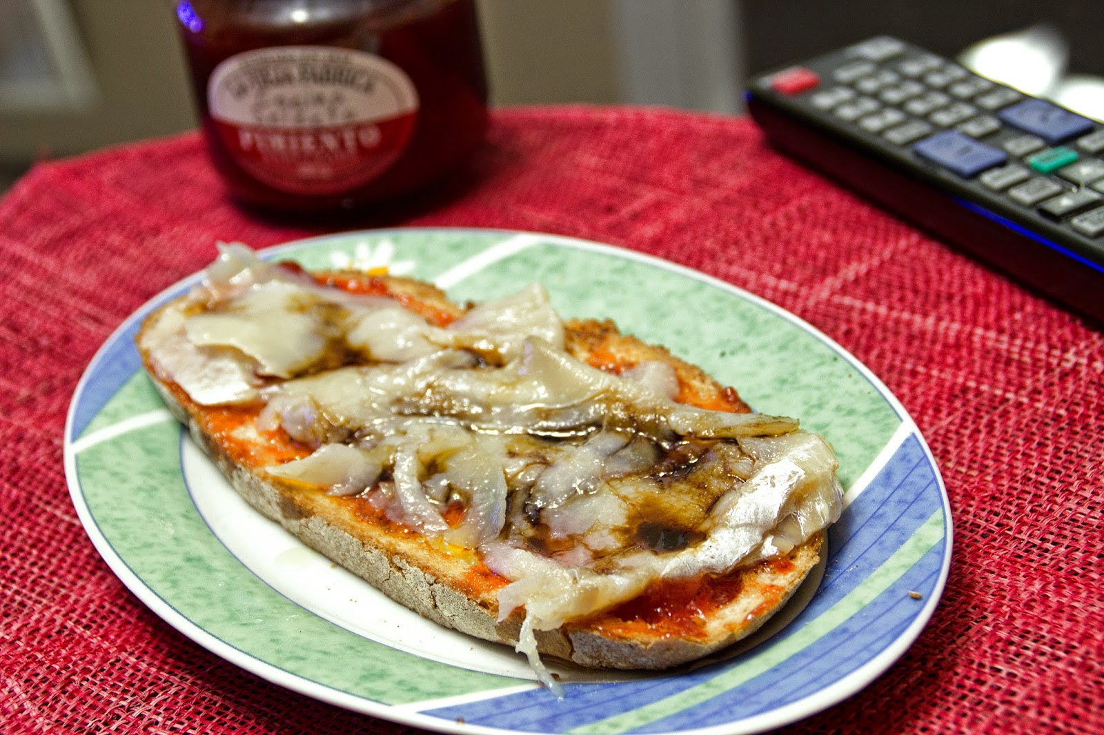 Una vez tostado el pan, sólo tenemos que poner encima los ingredientes. Colocamos el pimiento endulzado (es tipo mermelada por lo que es untable), el bacalao ahumado y por último echamos unas gotitas al gusto de vinagre de Módena (según nos guste más fuerte echaremos más o menos).