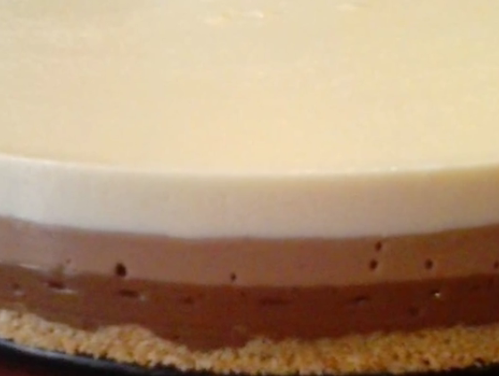 Preparamos la primera capa poniendo a fuego lento la nata, el chocolate y el azúcar. Mezclamos bien la cuajada y la leche y lo añadimos al cazo. Dejamos que hierva poco a poco, sin dejar de remover, y cuando esté, lo vertemos en la base de galletas. Dejamos enfriar un poco y lo metemos a la nevera .