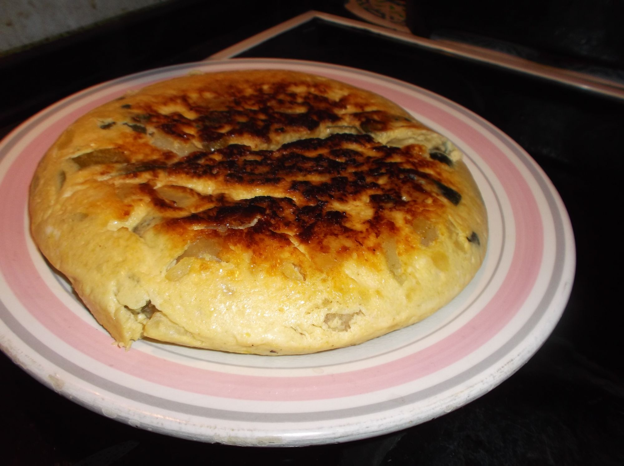 Como veis en la foto, es un clásico que el centro de la tortilla se me queme, y eso que con esta me esforcé en que no se quemara, pero no hay forma, quemao en el centro y crudo en los bordes... y eso que la hice a fuego lento y tapada...