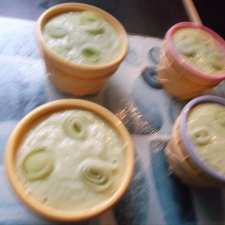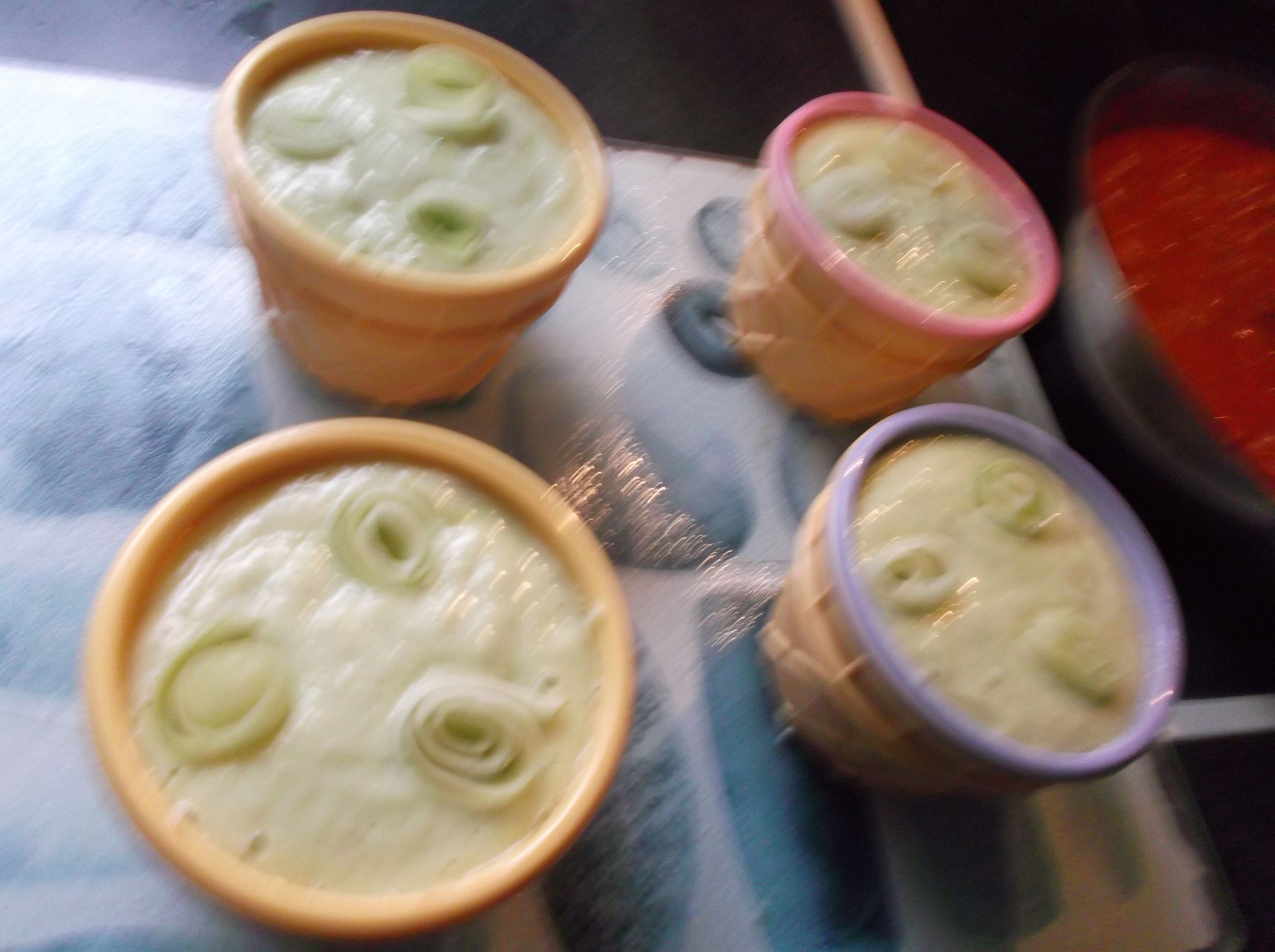 Repartimos en cuatro recipientes individuales y decoramos con las tiritas reservadas de pepino, colocando tres de ellas enrolladas sobre sí mismas como veis en la foto.