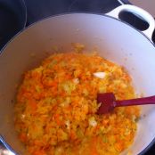 Picar las cebollas, zanahorias y el apio finamente. En una olla de fondo grueso con un poco de aceite de oliva, pochar las dos cebollas, dos zanahorias, el apio y los dos ajos. Añadir la rama de romero y la salvia. Pochar durante 15 min.