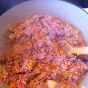 Añadir la carne picada y cocinarla hasta que se empiece a pegar al fondo Unos 10 min más.