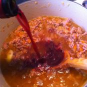 Incorporar hasta una botella de vino tinto. Dejar evaporar el vino y reducir hasta que esté casi seco.