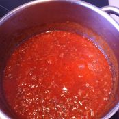 Añadir el tomate triturado y la passata de tomate y otras 2 tazas de agua. Dejar reducir a fuego bajo durante una hora y media o dos. O más si quieres.