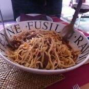 Cuando la salsa ya esté oscura, caramelizada, espesa y deliciosa, pon una olla con dos litros de agua a hervir. Cuando hierva, pon una cdta de sal y añade 500g de Tagliatelle all' ouvo, Penne Rigate, incluso Mafaldine o alguna pasta que tenga área de superficie para que se pegue bien la salsa. Cocina el tiempo que indica el fabricante.
