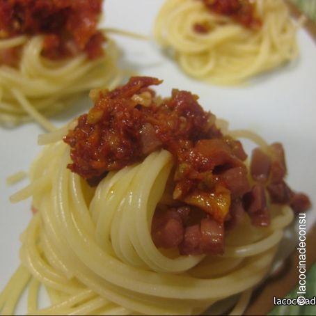 El pesto rojo es una salsa siciliana cuyo principal ingrediente son los tomates secos. En esta ocasión hemos preparado unos espaguetis a los que les hemos añadido pesto rojo y jamón. Una delicia.