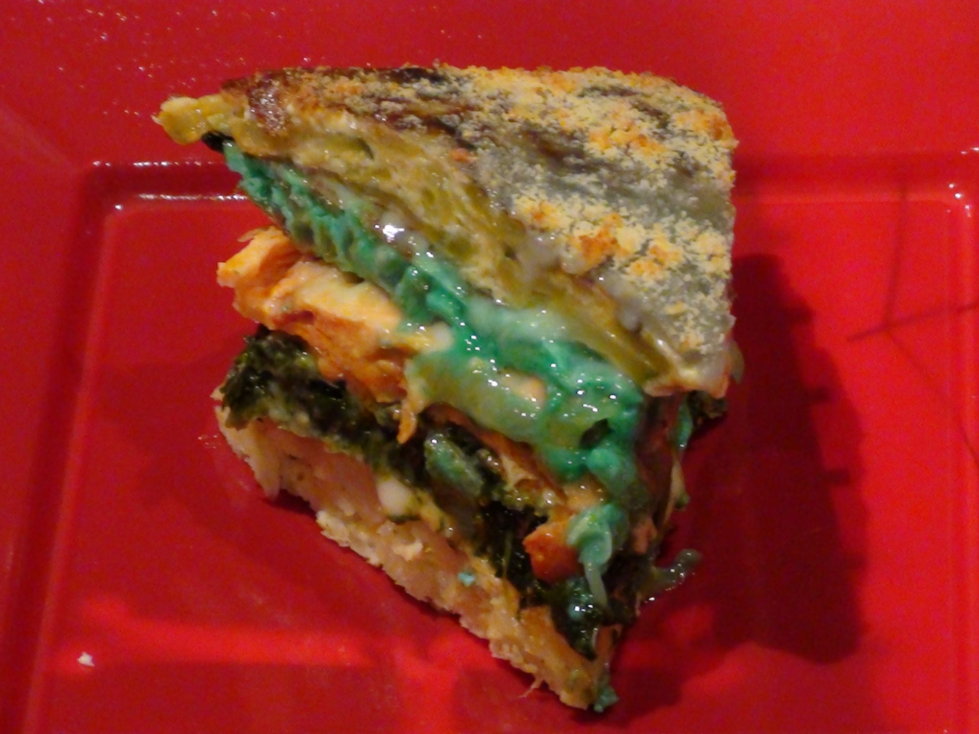 Montar las capas de tortilla entre las que pondremos un capa fina de bechamel coloreada, empezando por una de patata, la de espinacas, la de jamón, la de calabacín y terminar con otra de patata. Cubriremos todo con bechamel, a la que en algunos puntos pondremos colorante verde.