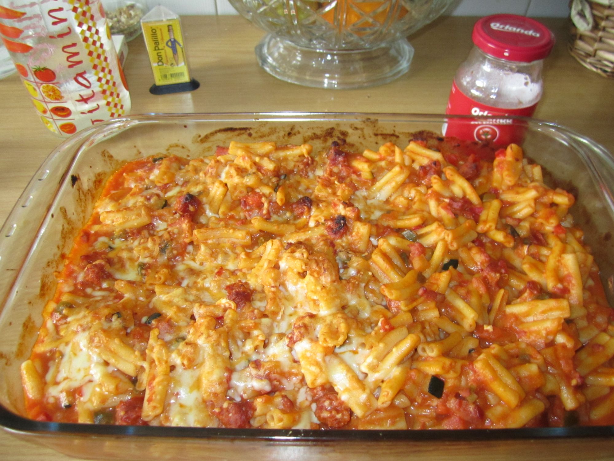 Echamos el contenido de la sartén en la fuente que teníamos reservada, cubrimos con el queso rallado y metemos los macarrones al horno, a gratinar, a 200°C durante unos 7 minutos (o el tiempo que tarde en ponerse dorado el queso).