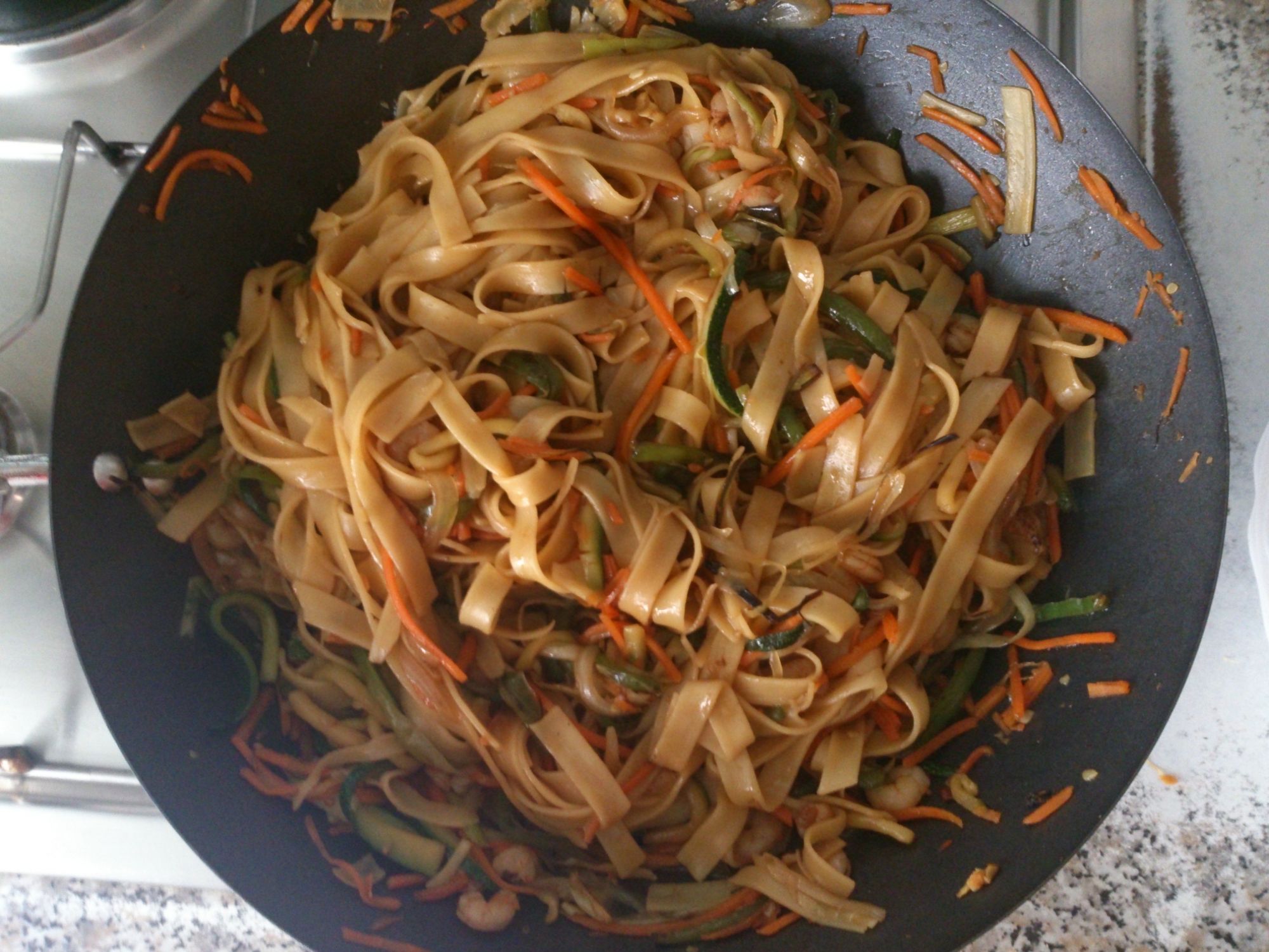 Ahora toca añadir las verduras a las gambas y a los brotes , les damos una vueltas y mezclamos. A continuación, añadimos la pasta, removemos y mezclamos y echamos la salsa de soja. Removemos un poco y servimos.