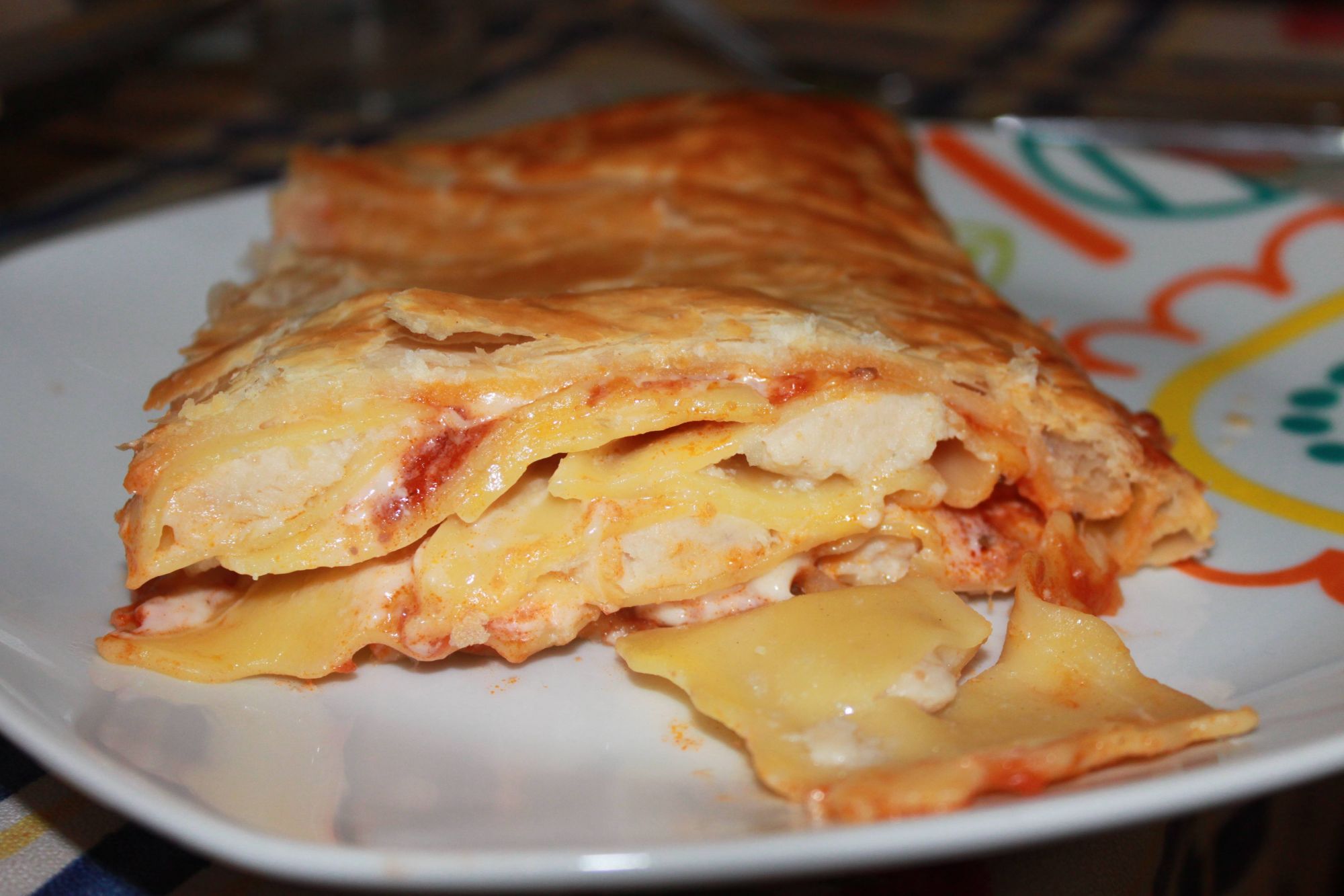 - En una bandeja de horno ponemos una lámina de hojaldre, pintamos con un poco de mantequilla y ponemos una capa de raviolis, encima una capa de salsa boloñesa, sobre ella nata y queso rallado.