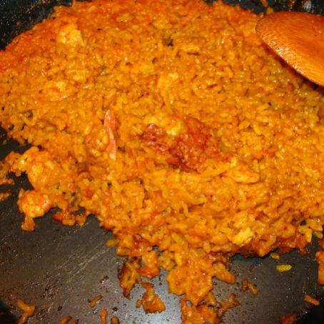 Añadir pimentón, tomate frito y hebras de azafrán.