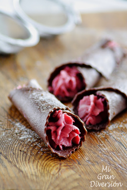 Preparamos la crema de frambuesa, mezclando todos los ingredientes hasta que estén integrados. Lo introducimos en una manga pastelera, extendemos la plancha de pasta y rellenamos.
