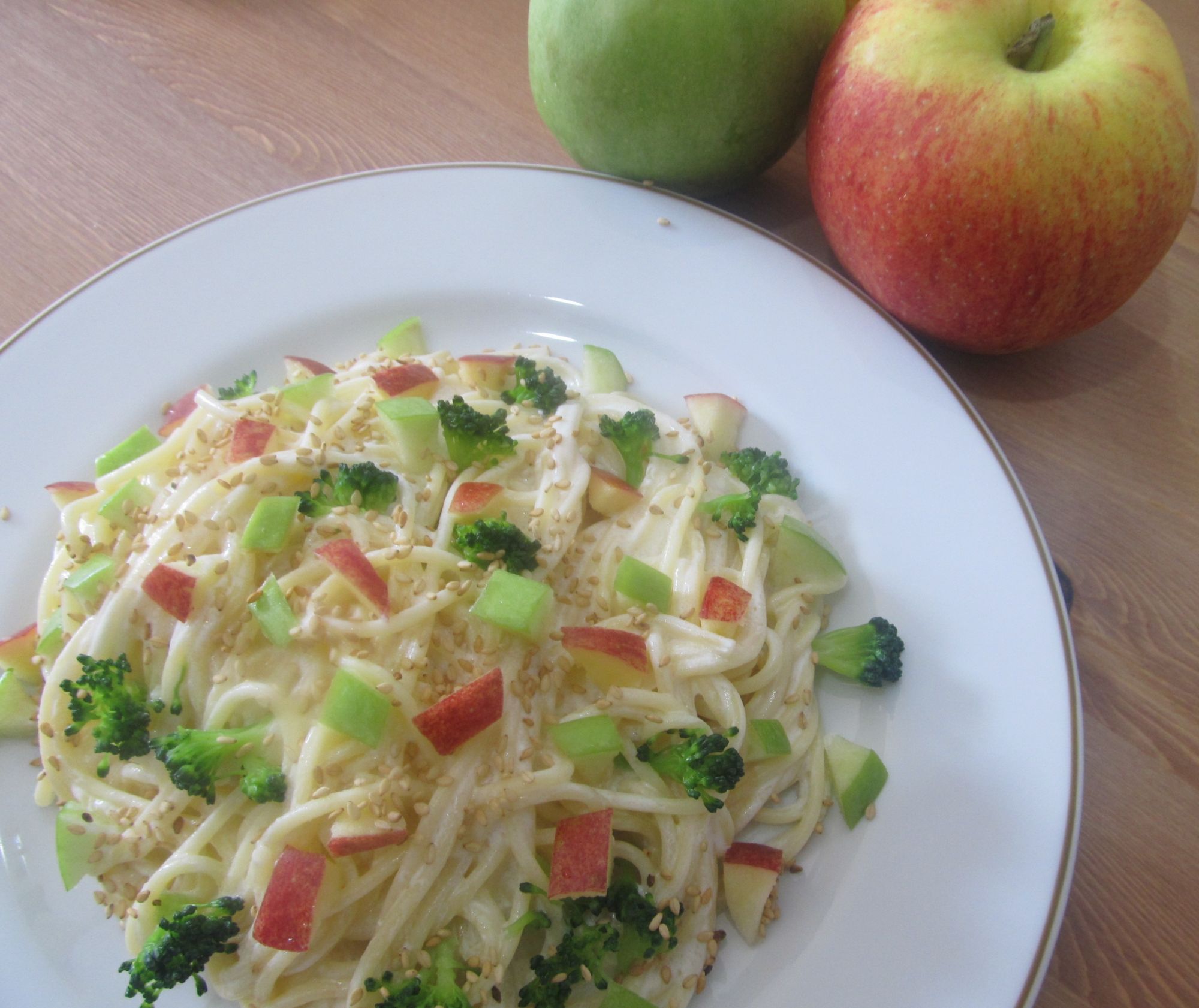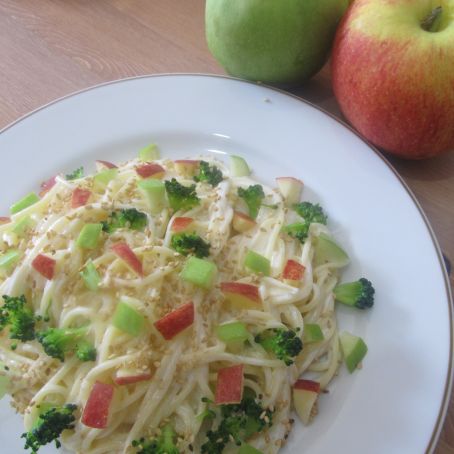 Con las otras dos mitades que nos habían quedado, cortamos las manzanas en dados pequeños y los echamos por encima de los espaguetis. Ponemos tambien brócoli hervido y espolvoreamos con semillas de sésamo.