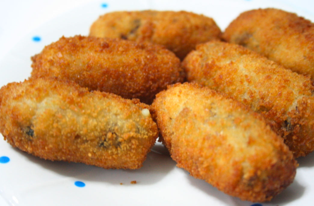 Preparamos en un plato el huevo batido y pan rallado , damos la forma que deseamos a las corquetas.