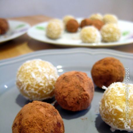 Para los panellets de coco agregamos 5 cucharadas de coco rallado a una de las bolas que hemos separado. Añadimos el aceite de coco y mezclamos bien y vamos formando bolitas. Cuando estén hechas las rebozamos con el coco restante (1 ó 2 cucharadas). Reservamos los panellets.