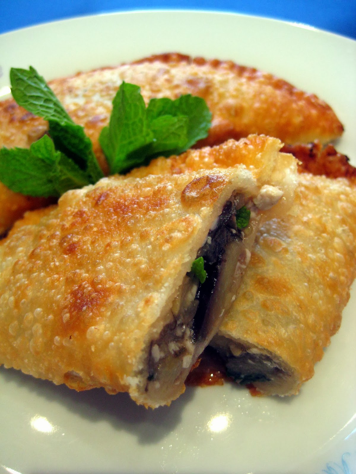 Lavamos las hojas de menta y las troceamos finamente. Añadimos a la sartén y mezclamos. Dejamos enfriar el relleno para que no se rompan las masas.