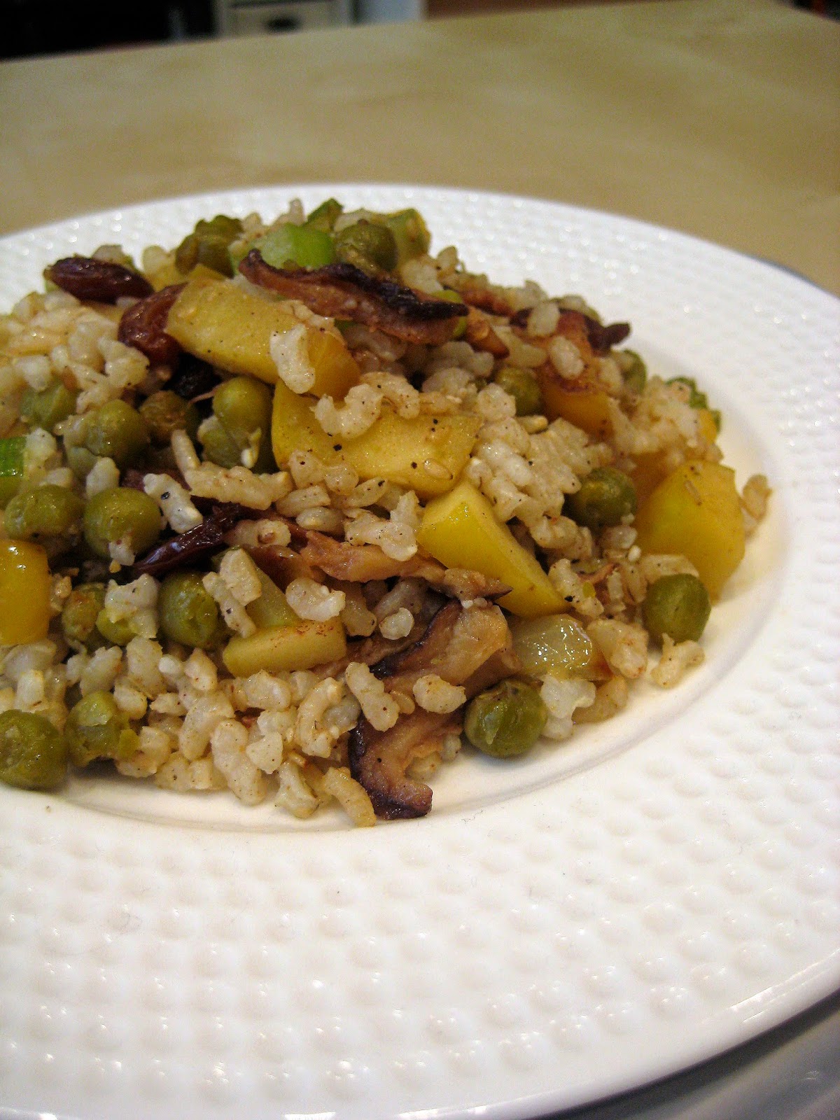 Ponemos abundante agua en una olla y echamos los 4 puñados de arroz integral cuando el agua todavía esté fría. Salamos el agua y cocemos el arroz hasta que esté cocido.