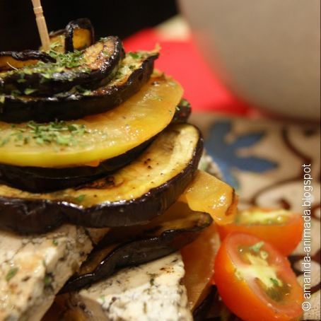 Comenzamos con un piso de berenjena, a continuación de tomate, y por último de tofu. Volvemos a repetir hasta conseguir la altura que queramos. Sujetemos con un palillo, echamos unas gotitas de limón y decoramos con perejil y un buen chorro de aceite de oliva virgen.