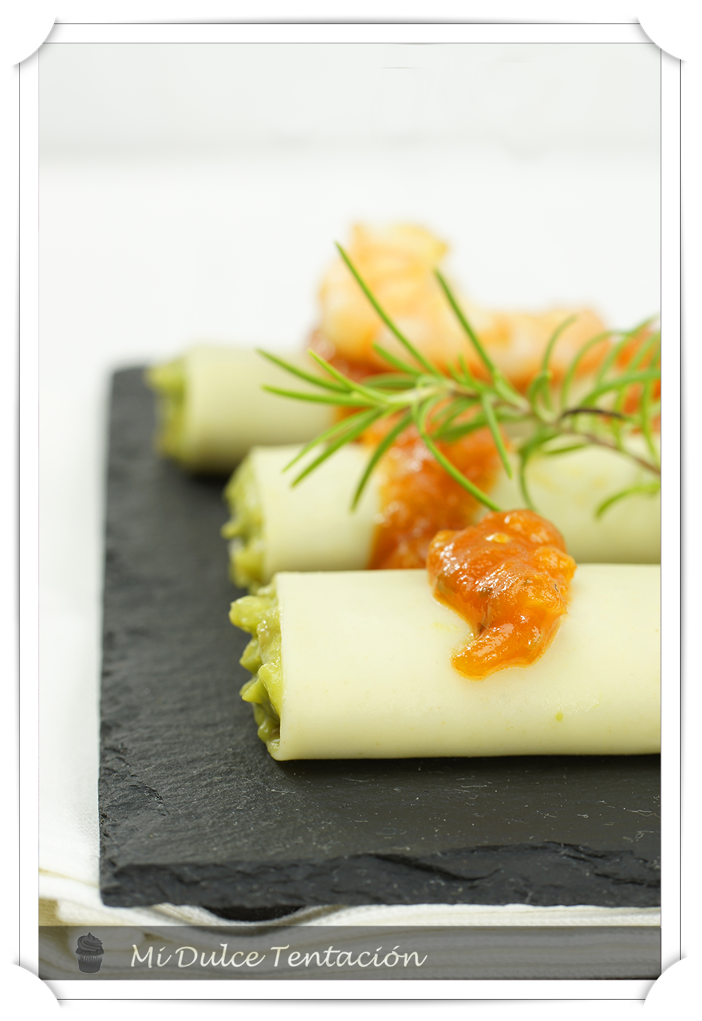 Para su montaje, rellenaremos los canelones con el aguacate y ponemos un poquito de salsa por encima.