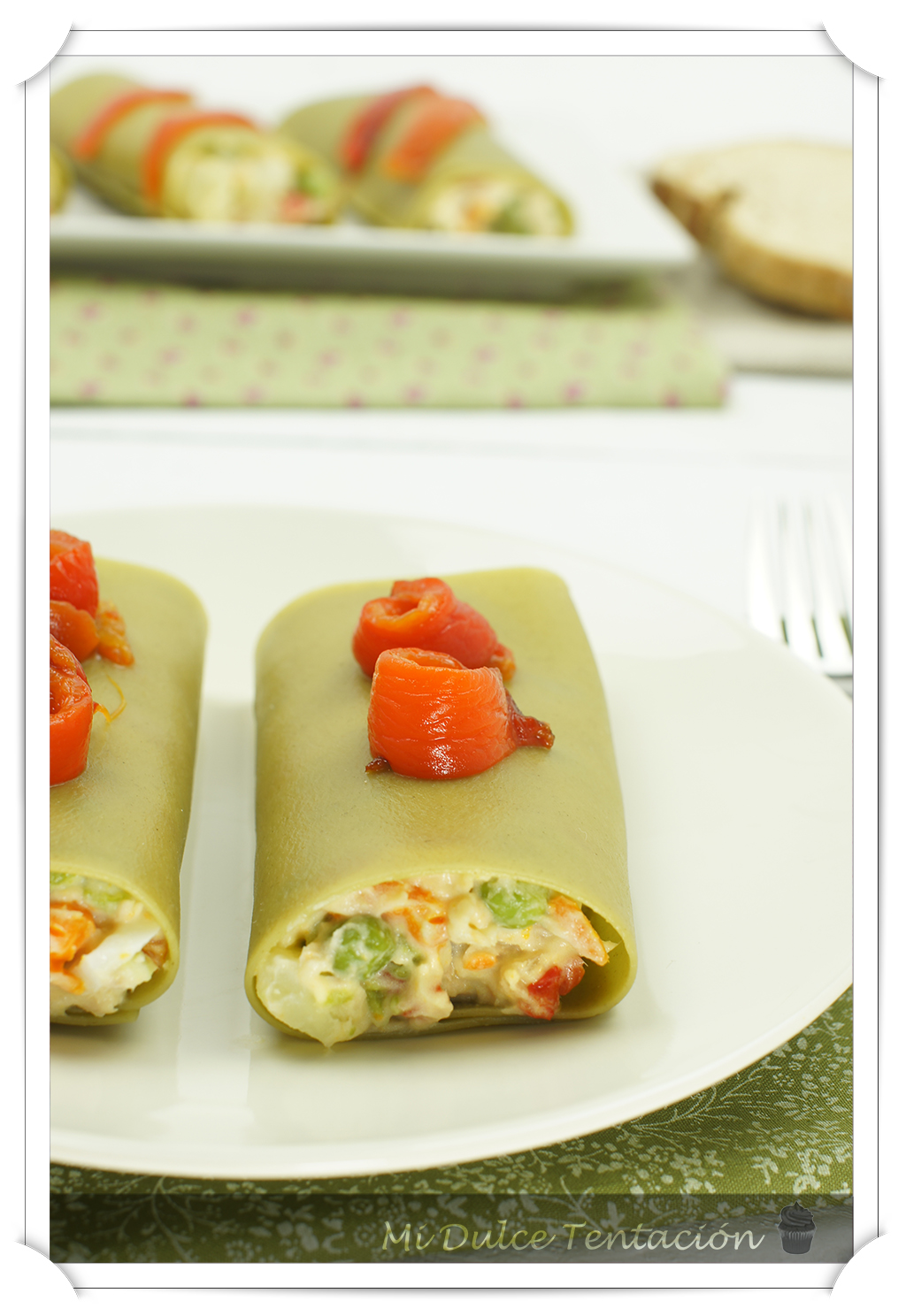 Antes de comer coceremos las placas de canelones en abundante agua salada el tiempo que el fabricante nos recomiende. Una vez cocidas las pondremos a escurrir en un paño y dejaremos que enfríen. Rellenaremos los canelones con dos cucharadas de ensaladilla rusa y envolveremos.