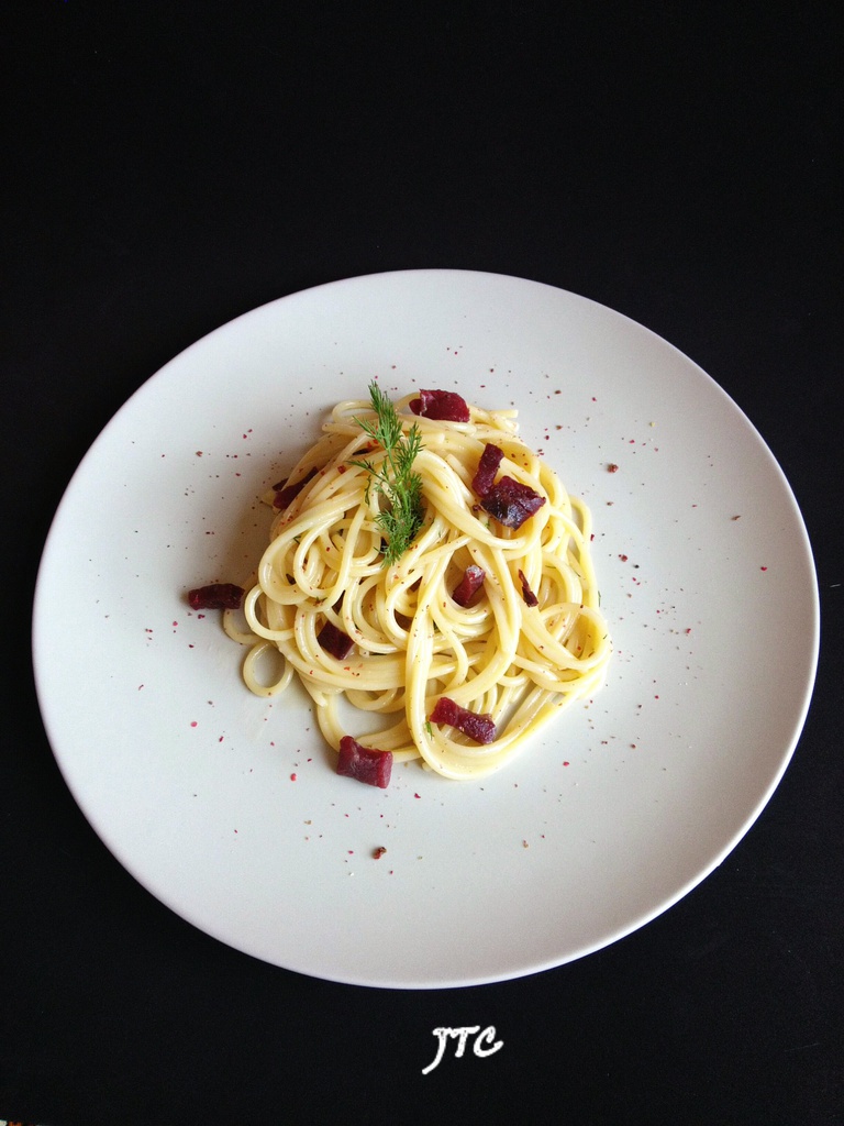 Spaguetoni con salsa carbonara tradicional con queso Idiazábal, tacos de cecina, eneldo y pimienta rosa.