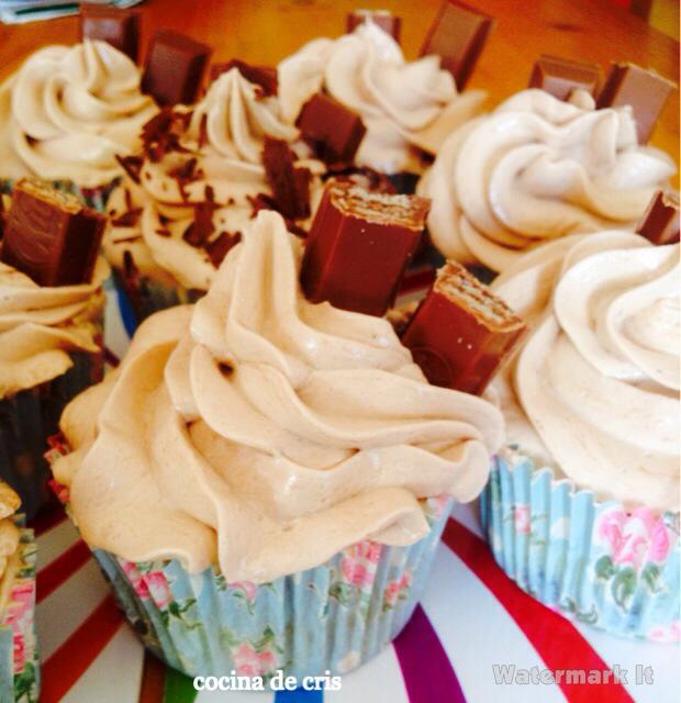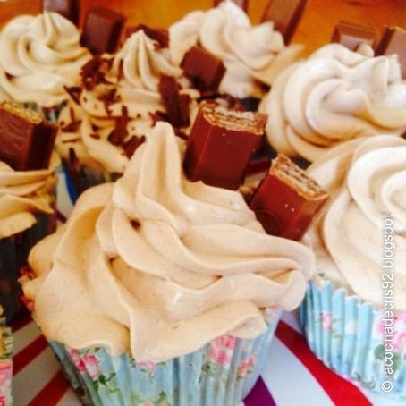 poner la mezcla en una manga pastelera y cubrir los cupcakes. Para decorarlos poner unos trocitos de kit kat.