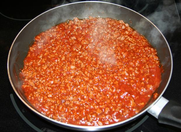 Añadir las dos clases de carne picada; sofreir, sin dejar de revolver, hasta que se deshaga en migas.