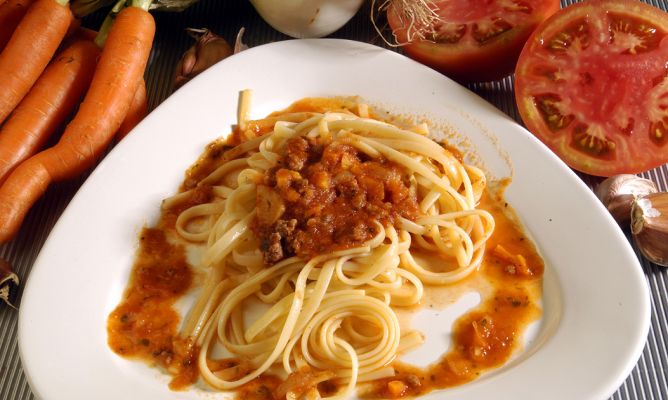Picar cebolla y zanahorias y pocharlas en un cazo con un pelín de aceite. Añadir el apio limpiado. Cuando se esté dorando añadir el vino, albahaca y la salsa de tomate; y dejarlo cocinar unos 10min.
