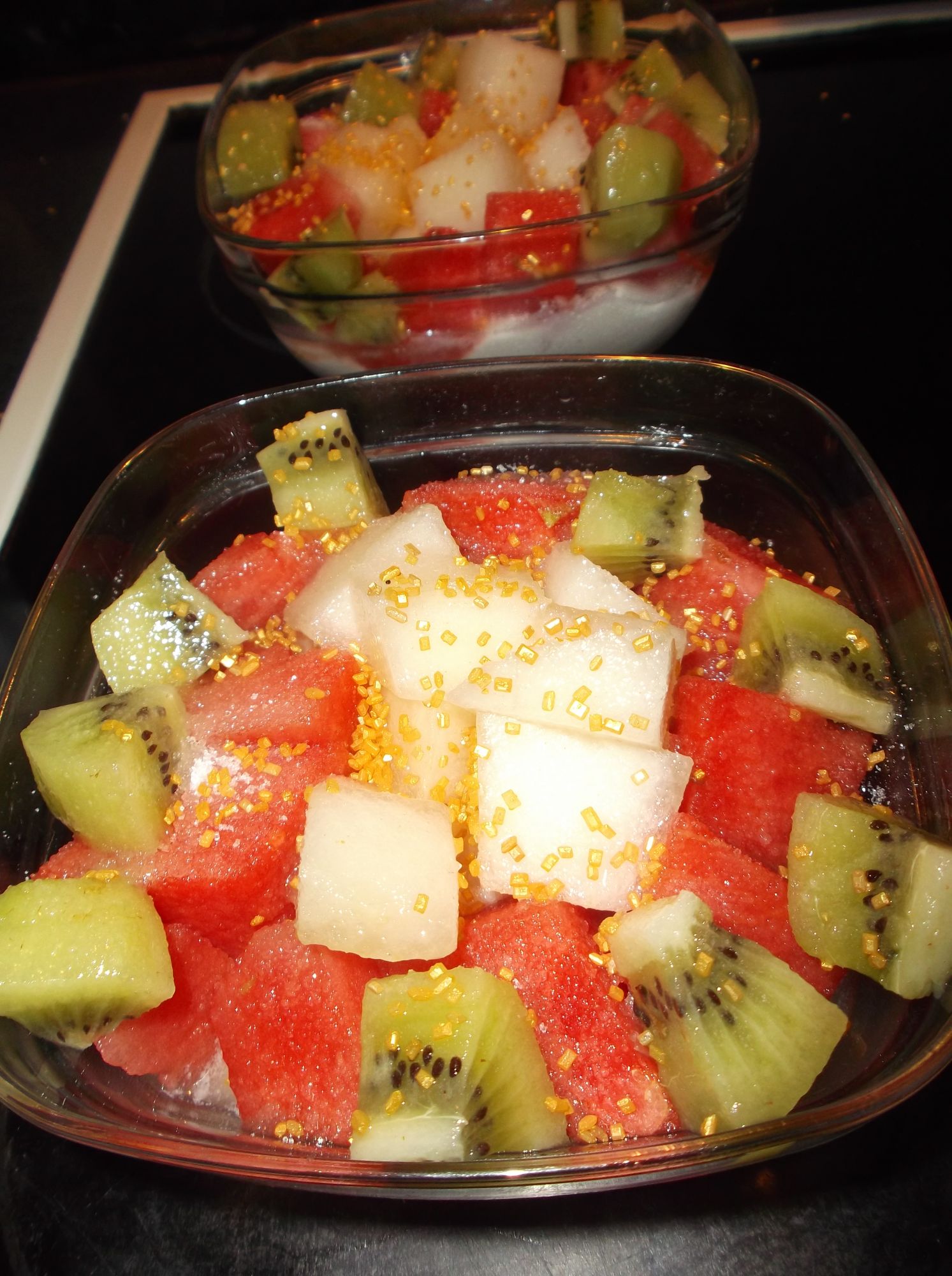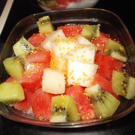 Después espolvoreamos sobre el melón el azúcar de oro generosamente, sin importar que manche la sandía ni el kiwi.