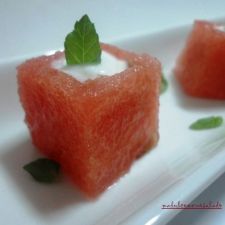 Cortamos la raja de sandía (no muy grande), desechamos su cascara y la cortamos a cuadraditos que repartiremos en dos cuencos, colocándolas sobre el yogurt, colocándola alrededor de las paredes del cuenco, dejando espacio en el centro para la raja del melón.