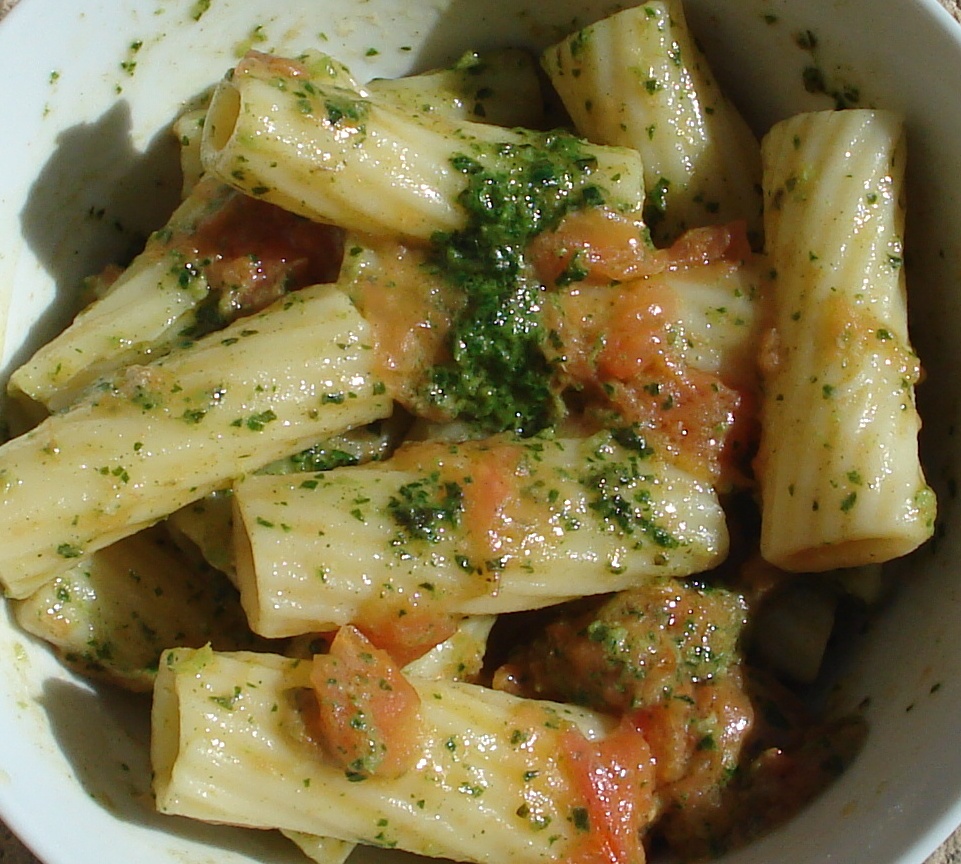 Tortiglioni con Pesto de acelgas, cilantro y semillas de calabaza