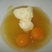 En un bol ponemos la miel, las dos cucharadas de mantequilla y los huevos. Lo mezclamos con las varillas.
