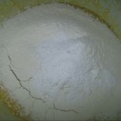 Añadimos la harina tamizada junto con la levadura. Batimos con las varillas.