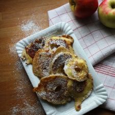 Calentamos la sartén (o si preferís hacerlo en freidora) con el aceite y vamos pasando cada rodaja de manzana por la mezcla y la echamos a la sartén.