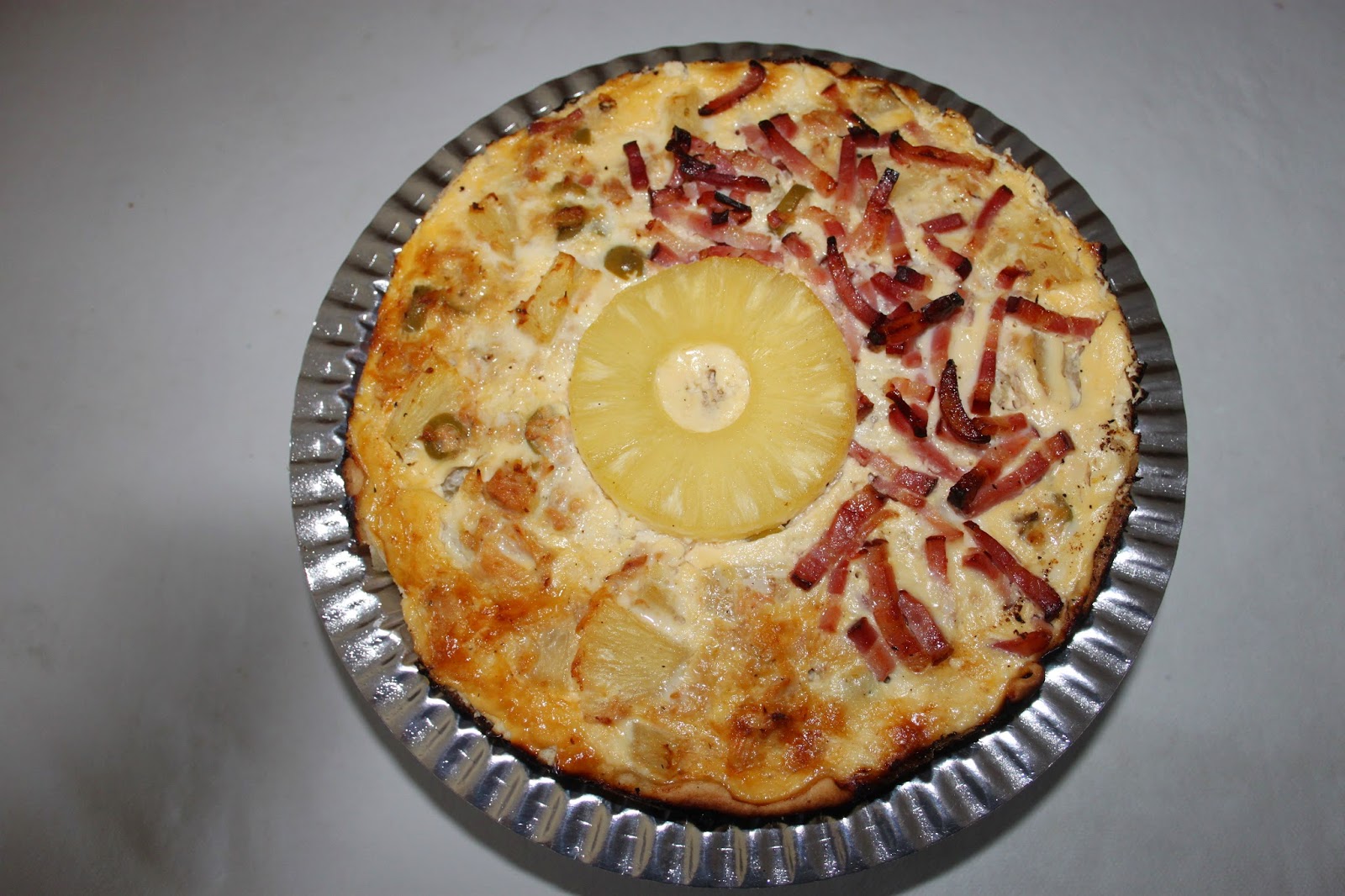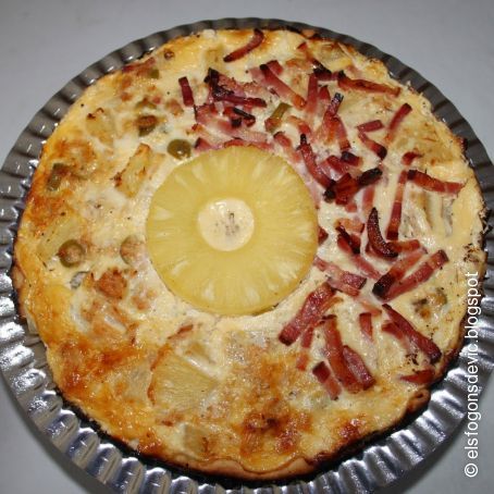 Mientras tenemos la masa al horno, cortamos las aceitunas a rodajas y la piña a dados (reservaremos una rodaja para ponerla encima). Ponemos todos los ingredientes en un bol y los mezclamos bien; tenemos que procurar que el huevo quede bien integrado.