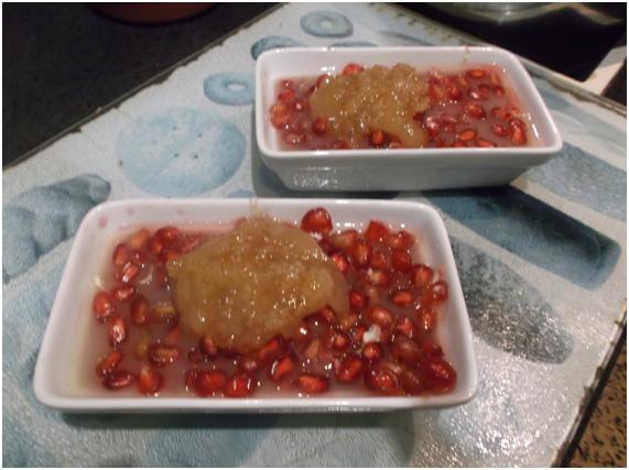 En esta ocasión os traigo un postre tonto, lo más complicado que tiene es desgranar la granada y lo “interesante” es que en lugar de regarla con vino dulce y azúcar utilizo un “Ponche de chirimoya casero” y miel.